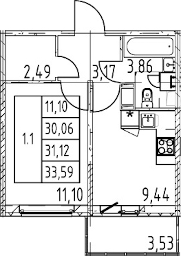 Однокомнатная квартира на 12-ом этаже 30,06 кв.м