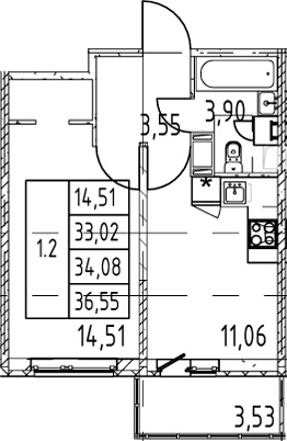 Однокомнатная квартира на 12-ом этаже 33,02 кв.м