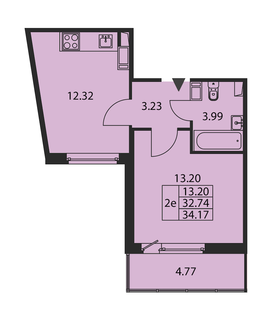 Однокомнатная квартира на 2-ом этаже 32,74 кв.м