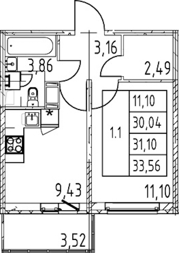 Однокомнатная квартира на 8-ом этаже 30,04 кв.м