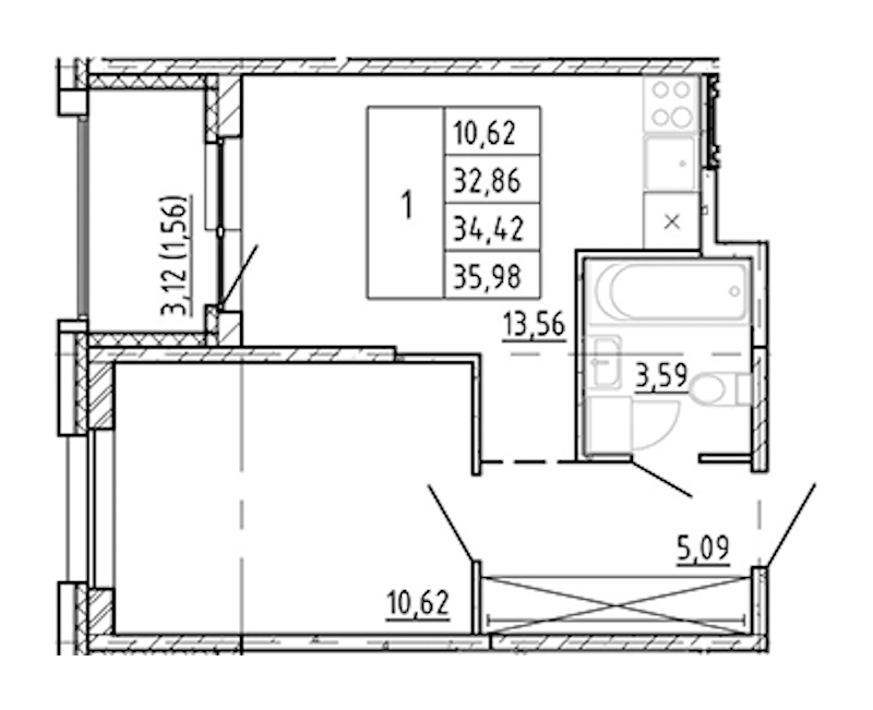 Однокомнатная квартира на 3-ем этаже 32,86 кв.м