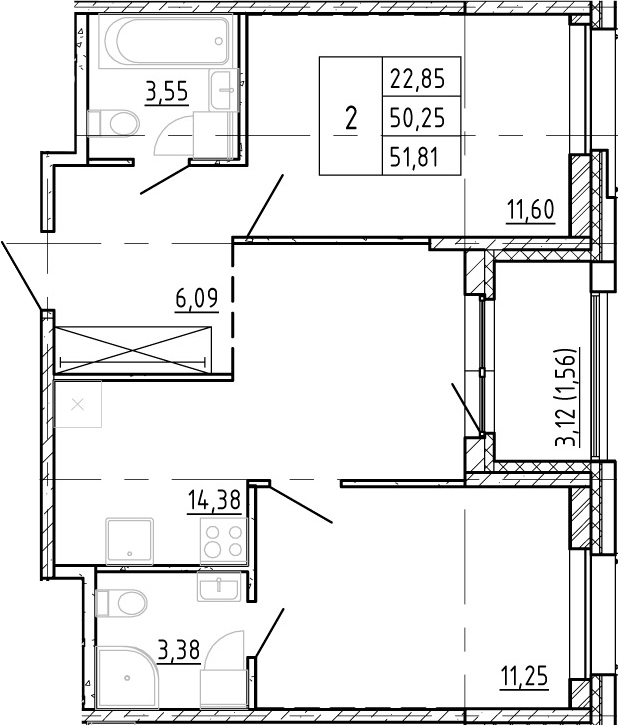 Двухкомнатная квартира на 2-ом этаже 50,25 кв.м