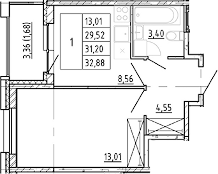 Однокомнатная квартира на 6-ом этаже 32,88 кв.м