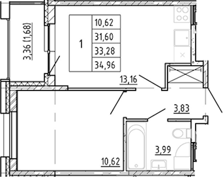 Однокомнатная квартира на 3-ем этаже 31,6 кв.м
