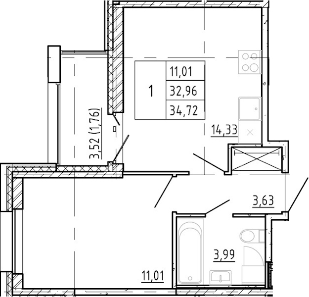 - Площадь кухни14,33 м2