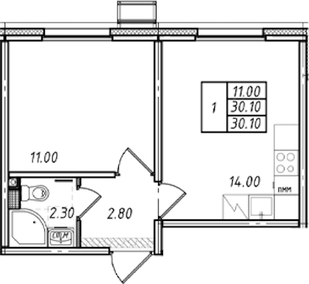 Однокомнатная квартира на 1-ом этаже 30,1 кв.м