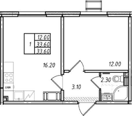 Однокомнатная квартира на 13-ом этаже 33,6 кв.м