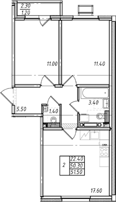 Двухкомнатная квартира на 2-ом этаже 51,5 кв.м