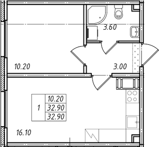 Однокомнатная квартира на 8-ом этаже 32,9 кв.м