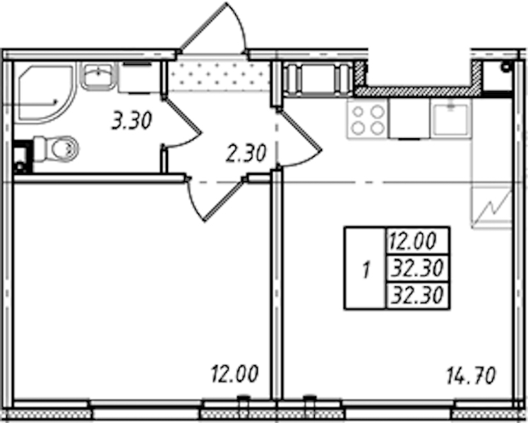 Однокомнатная квартира на 13-ом этаже 32,3 кв.м