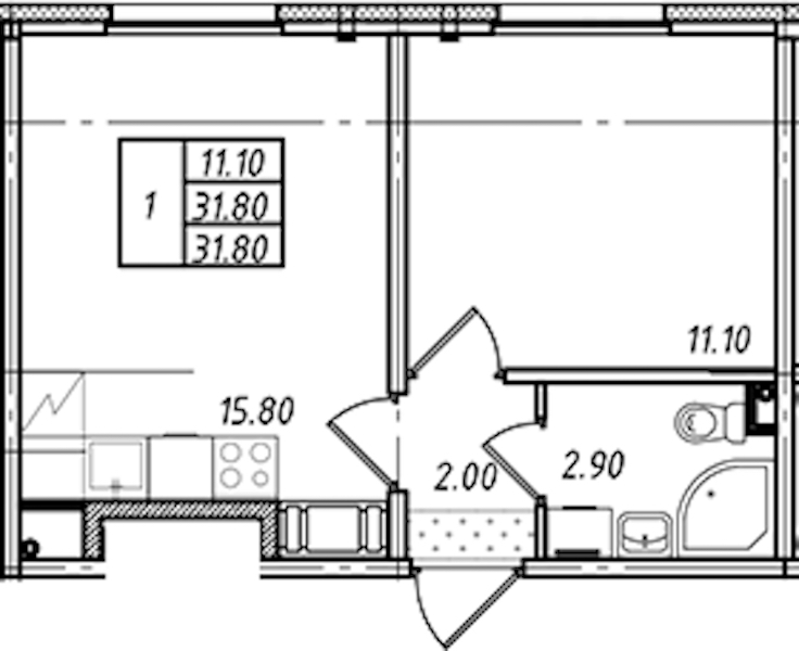 Однокомнатная квартира на 14-ом этаже 31,8 кв.м