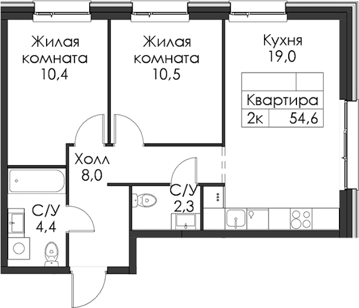 Двухкомнатная квартира на 8-ом этаже 54,6 кв.м