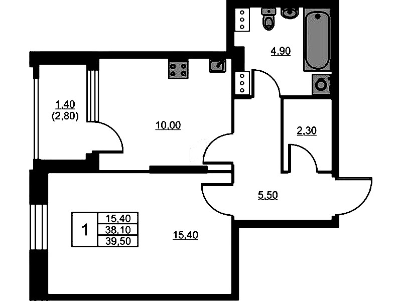 Однокомнатная квартира на 10-ом этаже 39,5 кв.м