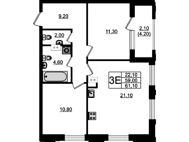 Двухкомнатная квартира на 9-ом этаже 61,1 кв.м