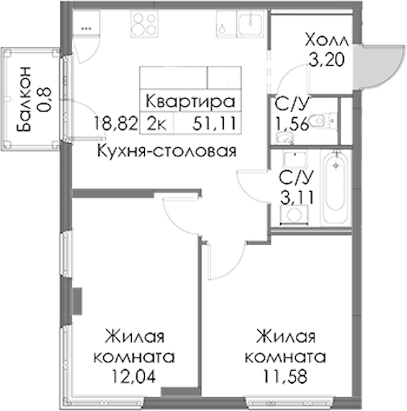 Двухкомнатная квартира на 4-ом этаже 51,11 кв.м