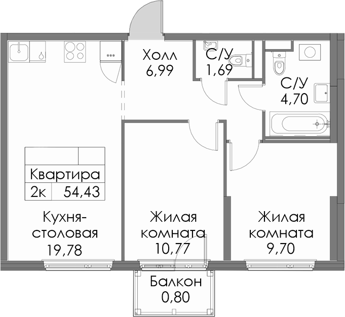 • Площадь54,43 м2
