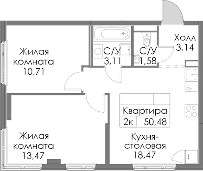 Двухкомнатная квартира на 12-ом этаже 50,48 кв.м