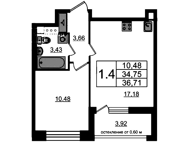 Однокомнатная квартира на 5-ом этаже 34,75 кв.м