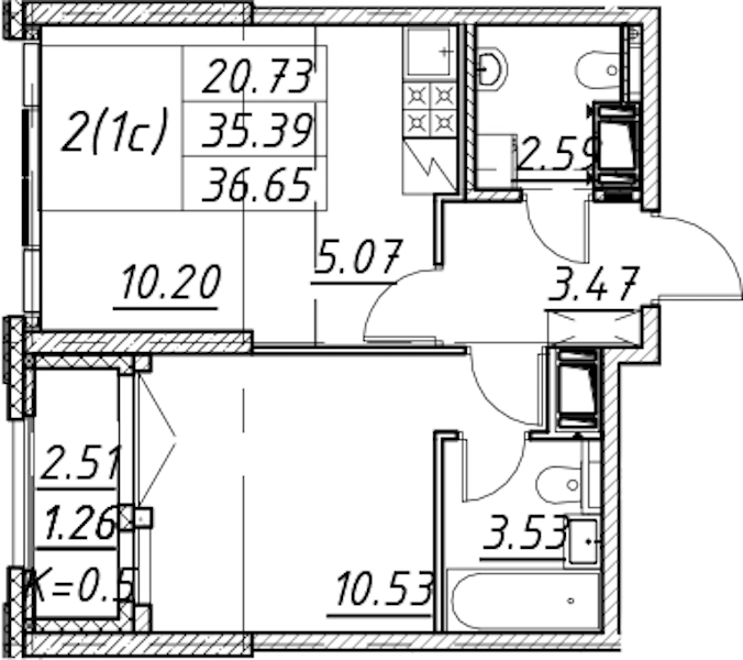 Однокомнатная квартира на 15-ом этаже 36,65 кв.м