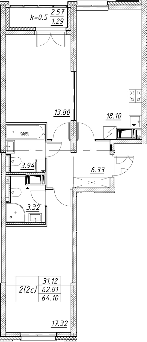 Двухкомнатная квартира на 15-ом этаже 64,1 кв.м