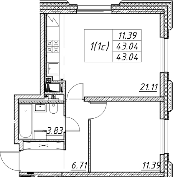 Однокомнатная квартира на 5-ом этаже 43,04 кв.м