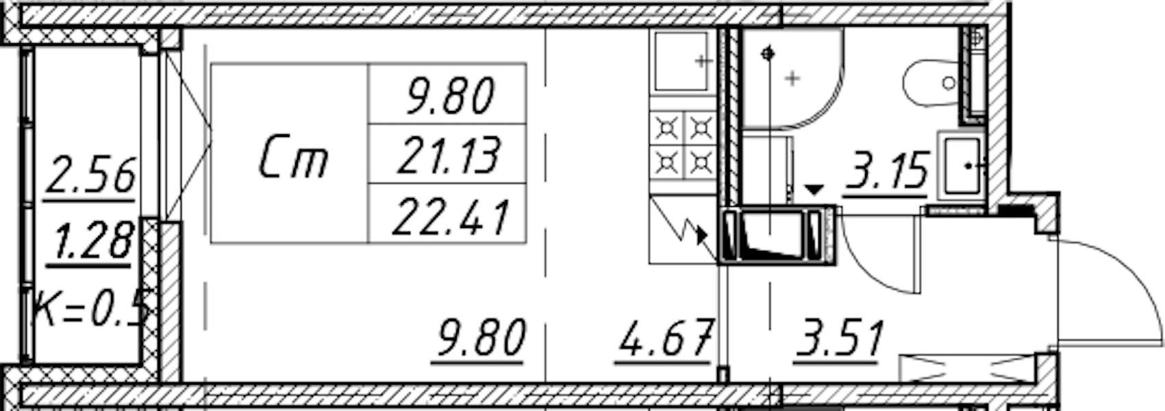 Квартира-студия на 10-ом этаже 22,41 кв.м