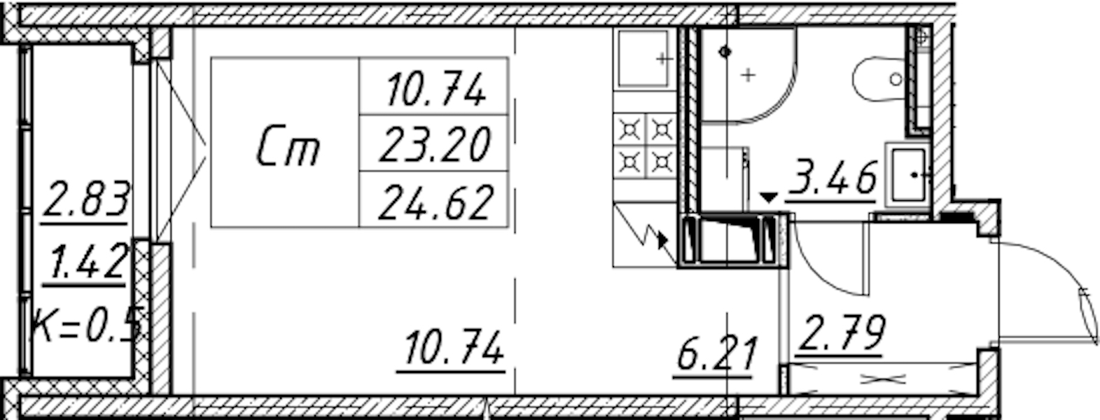 Квартира-студия на 10-ом этаже 24,62 кв.м