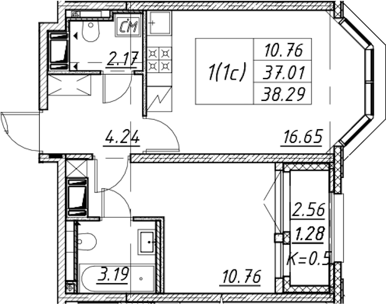 Однокомнатная квартира на 12-ом этаже 38,29 кв.м