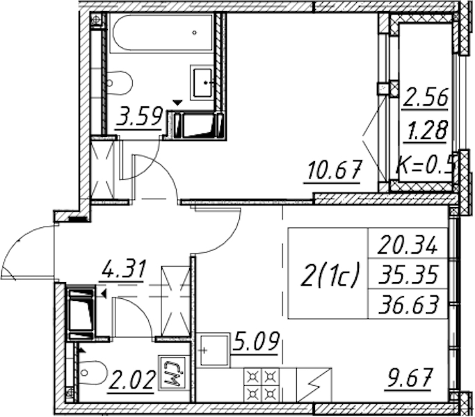 Однокомнатная квартира на 16-ом этаже 36,63 кв.м