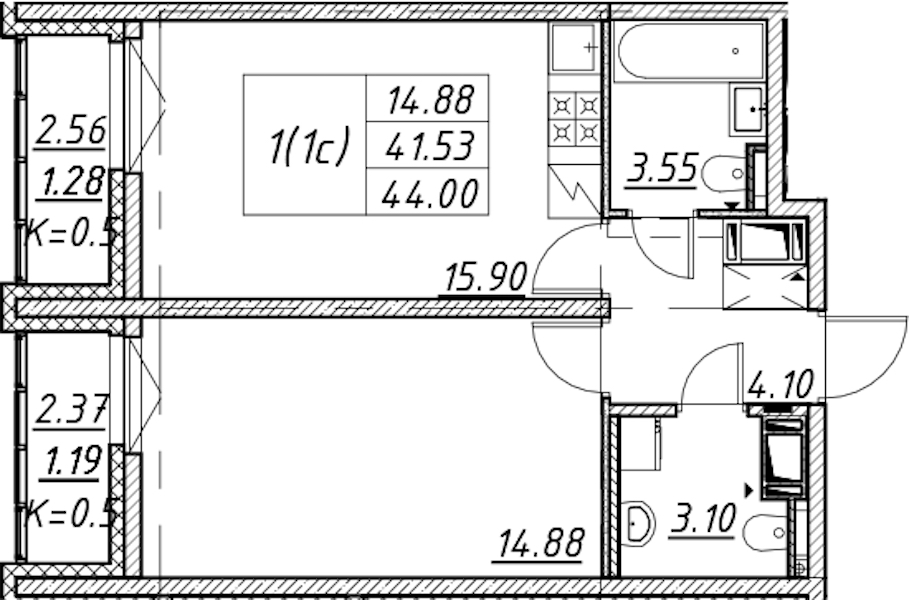 - Площадь44 м2