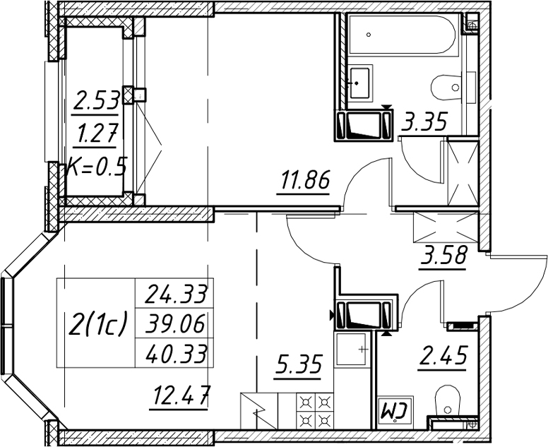 Однокомнатная квартира на 7-ом этаже 40,33 кв.м