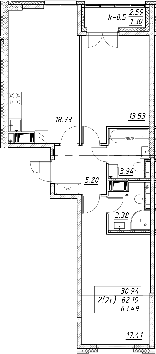 Двухкомнатная квартира на 16-ом этаже 63,49 кв.м