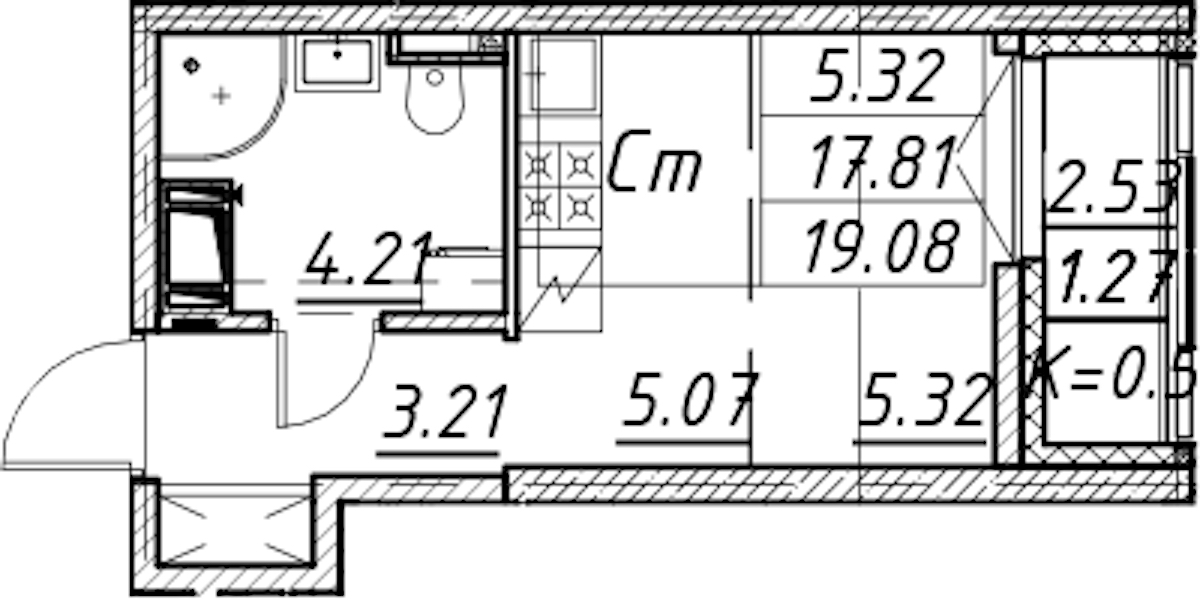 Квартира-студия на 16-ом этаже 19,08 кв.м