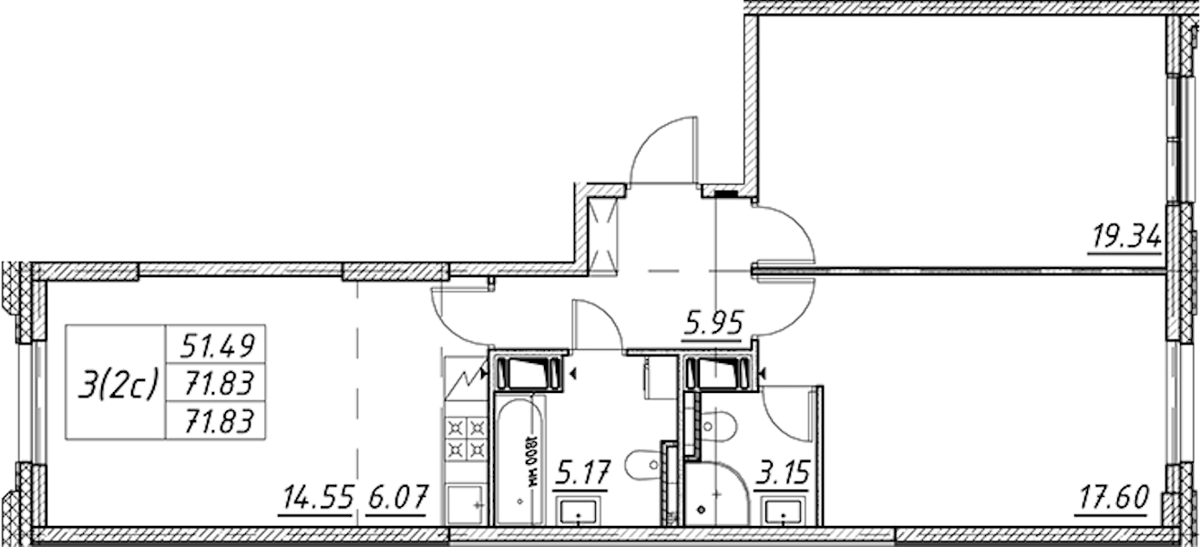 Двухкомнатная квартира на 4-ом этаже 71,83 кв.м