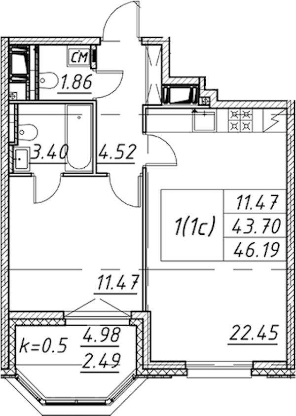 - Площадь46,19 м2