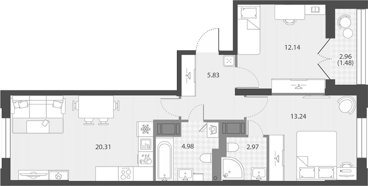 Двухкомнатная квартира на 13-ом этаже 60,95 кв.м