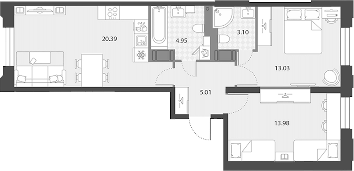 Двухкомнатная квартира на 3-ем этаже 60,46 кв.м