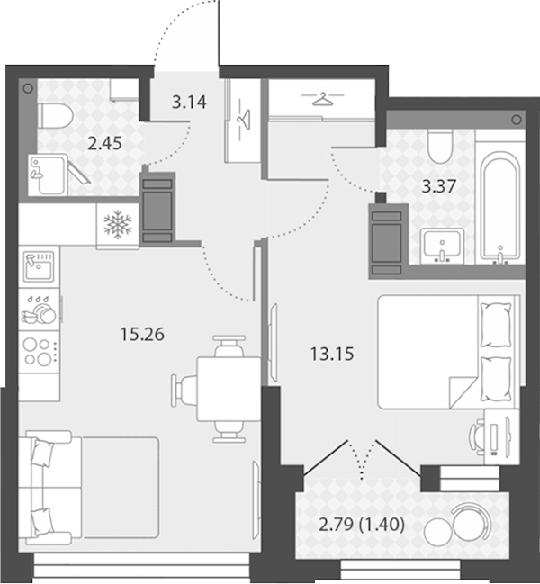 Однокомнатная квартира на 14-ом этаже 38,77 кв.м
