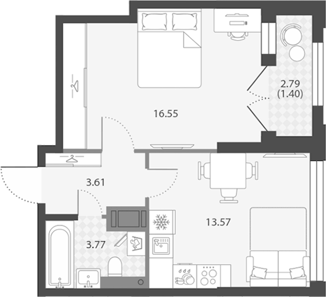 Однокомнатная квартира на 15-ом этаже 38,9 кв.м