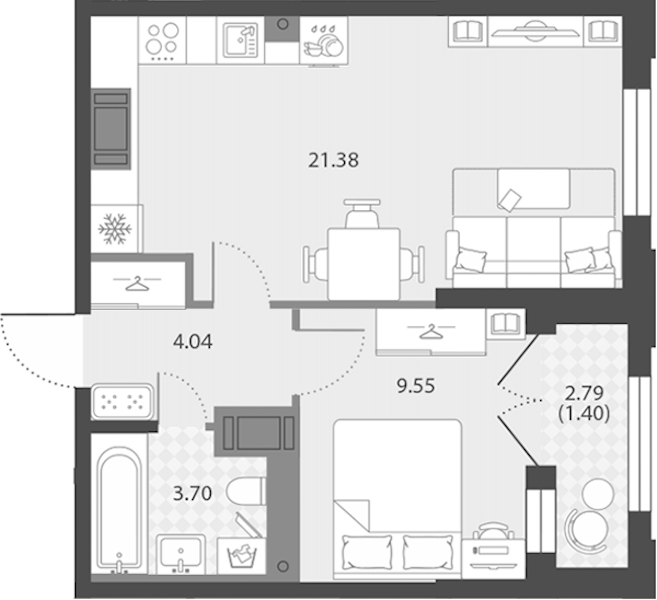 Однокомнатная квартира на 17-ом этаже 40,07 кв.м