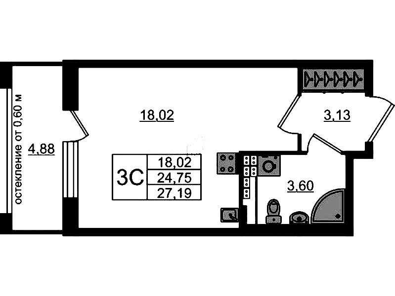 Квартира-студия на 4-ом этаже 24,75 кв.м