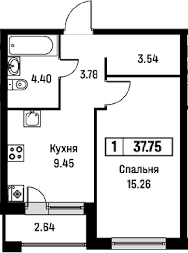 Однокомнатная квартира на 2-ом этаже 37,75 кв.м