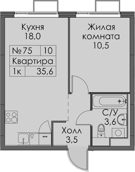 Однокомнатная квартира на 7-ом этаже 35,6 кв.м