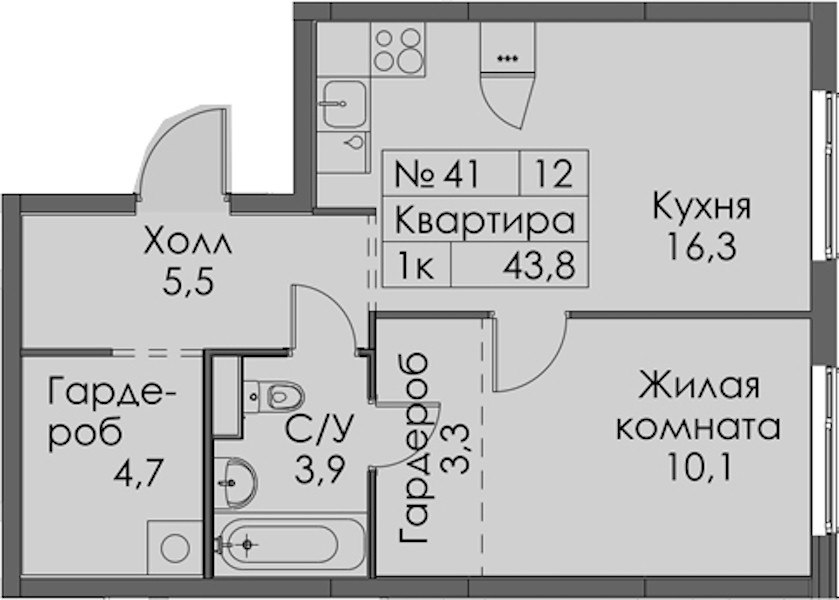 Однокомнатная квартира на 4-ом этаже 43,8 кв.м