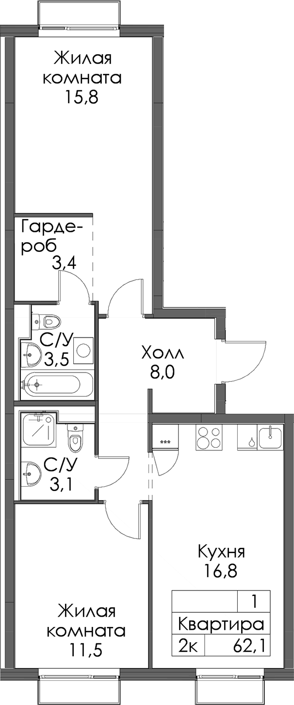 Двухкомнатная квартира на 11-ом этаже 62,1 кв.м