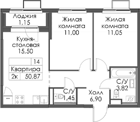 Двухкомнатная квартира на 15-ом этаже 50,87 кв.м