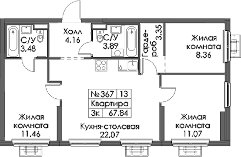 Трёхкомнатная квартира на 22-ом этаже 67,84 кв.м