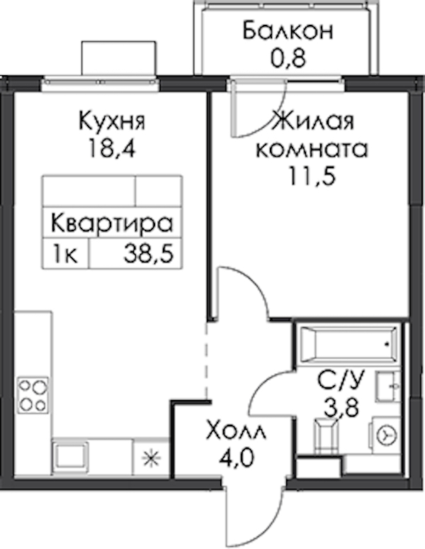 Однокомнатная квартира на 19-ом этаже 38,5 кв.м