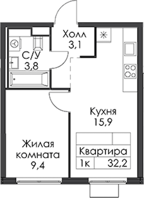 Однокомнатная квартира на 24-ом этаже 32,2 кв.м