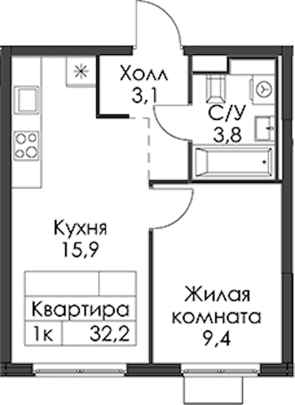 Однокомнатная квартира на 20-ом этаже 32,2 кв.м